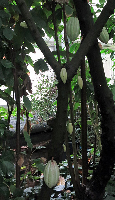 Der Kakaobaum (Theobroma cacao) wird heute in die Familie der Malvengewächse eingeordnet. Er wächst im schattigen Unterholz als immergrüne Pflanze mit dichtbelaubter Krone in tropischem Klima, wo ausreichend hohe Temperaturen (24 28°C) vorherrschen und Niederschlagsmengen von mindestens 1500-2000 mm pro Jahr fallen. Er wird bis zu zehn Meter hoch. Junge Blätter sind zunächst kupfer- bis bronzefarben, voll entwickelte Blätter dunkelgrün, zwanzig bis vierzig Zentimeter lang, derb-ledrig mit kurzer Spitze. Wer schon einmal im Tropenhaus eines Botanischen Gartens einen Kakaobaum gesehen hat, dem ist vielleicht aufgefallen, dass die kleinen grünlich-weißen Blüten direkt am Stamm entspringen, was man botanisch als Kauliflorie/Stammblütigkeit bezeichnet. Auch an blattlosen, starken Seitenästen werden Blüten ausgebildet, Ramiflorie genannt. Die Bestäubung übernehmen kleine Fliegen der Gattung Forcipomyia. Aus nur etwa jeder fünfhundertsten Blüte entwickelt sich innerhalb von fünf bis acht Monaten eine fünfzehn bis zwanzig Zentimeter lange, ellipsoide, gelb bis rotbraun gefärbte Frucht mit zwanzig bis sechzig mandelförmigen bräunlichen Samen, die von einem weißen, süßen, sehr schmackhaften Fruchtfleisch (Pulpa) umgeben sind. Die als Kakaobohnen bezeichneten Samen schmecken frisch geerntet eher fade. Erst durch den Fermentationsprozess und die anschließende Röstung erhält der Kakao sein typisches Aroma. Zur Gewinnung von Kakaopulver werden die gerösteten Samen zermahlen, erwärmt und gepresst. Der Pressrückstand wird zu Kakaopulver gemahlen und kann als Rohstoff in der Schokoladenproduktion eingesetzt werden. Das abgepresste Fett, die Kakaobutter, wird bei der Herstellung von Milch- und weißer Schokolade verwendet. In der pharmazeutischen und kosmetischen Industrie kommt sie als Grundlage von Salben, bei der Herstellung von Zäpfen und Lippenstiften zum Einsatz.