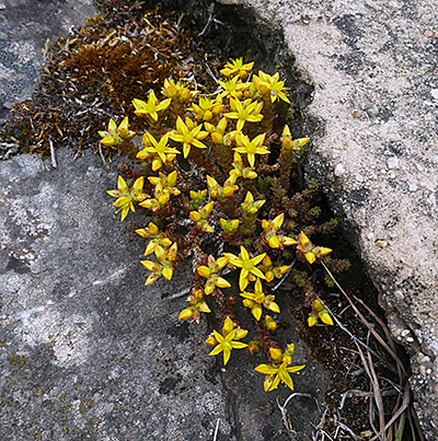 Es ist immer wieder erstaunlich zu sehen, wie manche Pflanzen an äußerst widrigen Standorten wachsen können. So beherbergen die Mauern alter Burgen eine Vielfalt von Pflanzen, die sich mit den mageren Lebensbedingungen in den Ritzen zufriedengeben. Im Juni/Juli leuchten in den Spalten zwischen den Steinen der Burg Reifferscheid in der Eifel die goldgelben sternförmigen Blüten des Scharfen Mauerpfeffers (Sedum acre), der auch Scharfe Fetthenne genannt wird. Er gehört zur Familie der Dickblattgewächse (Crassulaceae) und ist in ganz Europa verbreitet. Er liebt sonnige Standorte mit sehr durchlässigen Böden: Mauer-, Felsspalten, Dünen, lichte Kiefernwälder, sandige Ruderalstellen wie Bahndämme oder Steinbrüche, und wächst häufig an Weg- und Straßenrändern direkt an der Teerkante. Der Scharfe Mauerpfeffer wird fünf bis fünfzehn Zentimeter hoch und bildet mit seinen immergrünen, über den Boden kriechenden Sprossen kompakte, gelblich-grüne Rasen. Seine kleinen dickfleischigen Blätter schmecken, wenn man sie kaut, scharf und pfeffrig, eine Eigenschaft, worauf sich sein Name bezieht.