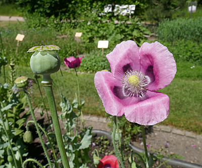 Der Schlafmohn ist in diesem Jahr zur Giftpflanze des Jahres gekürt worden. Denn das im 19.Jh. zur Modedroge gewordene Opium und das 1805 durch den Apotheker Friedrich Sertürner erstmals isolierte reine Morphin bergen ein hohes Suchtpotenzial mit tiefgreifenden Auswirkungen auf das zentrale Nervensystem. Bei Überdosierung kann es zu Atemlähmung, Lungen- und Hirnödemen führen.