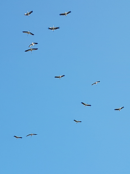 Die Storchenmänner sind im Frühjahr als erste aus dem Süden zurück und besetzen den Horst des Vorjahres. Sie sind in dieser Hinsicht sehr ortstreu. Die Weibchen kommen später und die Paare bleiben, wenn sie den Zug und die vielen Gefährdungen überleben, auf Jahre zusammen. Die Nester werden auf Dächern, Schornsteinen, Kirchtürmen, Masten oder Bäumen jedenfalls immer in der Höhe errichtet und über die Jahre weitergebaut und ausgebessert. März/Anfang April legt das Weibchen 3-5 Eier. Nach gut einem Monat schlüpfen die Jungen. Beide Elternteile füttern und versorgen sie an sehr heißen Tagen auch mit Wasser. Diese stehen nach 22 Tagen im Nest und sind nach 55-60 Tagen flügge. Nach etwa 90 Tagen sind sie unabhängig von den Eltern. Ende August ziehen dann die ersten Jungvögel gen Süden. Zufällig konnte ich mit Anderen am 24. August an einem sonnigen Tag in Aachen-Melaten beobachten, wie eine Schar Jungvögel die Thermik für den Segelflug nutzend in weiten Kreisen fliegend sich in die Höhe tragen ließ. Allmählich drifteten sie so in Richtung Süden ab. Die Altvögel folgen dann im September. Die europäische Storchenpopulation teilt sich entlang einer Zugscheide, die vom Ijsselmeer, Osnabrück, den Südwestharz, Kyffhäuser, Regnitz, Lech bis ins Alpenvorland verläuft, in West- und Ostzieher. Erstere fliegen über Frankreich, Spanien nach Westafrika. Letztere ziehen über den Bosporus, Syrien, den Jordan und Sinai, den Golf von Suez ins Niltal nach Ost- und Südafrika.