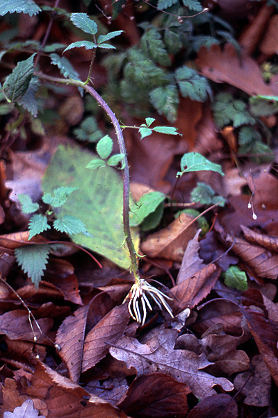 Diese Brombeere wächst in flachem Bogen über den Boden, wurzelt im Herbst am Ende wieder ein, und bildet so richtige Fallstricke.