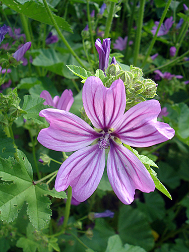 Wilde Malve (Malva sylvestris)Der Eibisch ist eine schöne, ausdauernde, bis zu zwei Meter hohe Gartenpflanze mit samtig weichen Blättern und weißen bis rosafarbenen Blüten. Die fünf Blütenblätter umgeben eine ein Zentimeter lange Röhre (Columna), zu der die zahlreichen Staubblätter verwachsen sind. Dies ist charakteristisch für alle Malvengewächse, dass die Staubblätter mit ihren Filamenten (Staubfäden) zu einer Säule verwachsen, die den Griffel umhüllt und an der Spitze nur die Narbe freigibt. Das gilt auch für Hibiskus, Baumwolle und Okra, die ebenfalls zu den Malvengewächsen gehören.