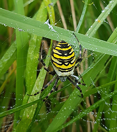 Mit ihrem schwarz-gelben Muster stellt die Wespenspinne (Argiope bruennichi) einen einprägsamen Vertreter ihrer Ordnung dar. Während die Spinnenart früher nur selten in NRW anzutreffen war, breitete sie sich ab der Hälfte des letzten Jahrhunderts über ganz Deutschland, Nord- und Mitteleuropa aus. Da die Spinnengattung Argiope, zu der die Wespenspinne gehört, in den warmen Gebieten der Kontinente heimisch ist, wird vermutlich das wärmer werdende Klima für die Verbreitung verantwortlich sein.