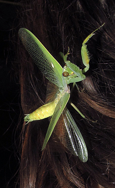 Wegen des Klimawandels auch hierzulande häufig anzutreffen: Eine Gottesanbeterin.Eine weitere interessante Eigenschaft der Mantis ist ihre der Feindabwehr dienende Droh- oder Schreckstellung. Bei dieser werden die Vorderbeine nach oben bewegt, sodass die auf der Innenseite liegenden schwarzumrandeten weißen Flecken zu sehen sind. Diese wirken wie Augen eines größeren Tiers und stellen damit eine Mimikry dar. Zusätzlich erfolgt durch das Ausbreiten der Flügel ein zischendes Geräusch, welches in kurzen Abständen mehrmals wiederholt wird. Die Gottesanbeterin selbst nimmt Geräusche über ein auf der Brust sitzendes, unpaariges Hörorgan wahr.