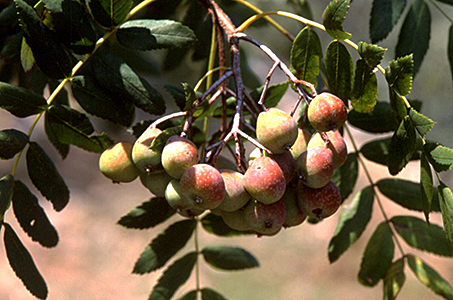 Der Speierling. Sorbus domestica, hat ebenfalls Fiederblätter, die Fiederchen sind ungestielt im Gegensatz zur Vogelbeere, bei der sie kurzgestielt sind. Das beste Unterscheidungsmerkmal ist aber der Rand der Fiederblättchen. Bei der Vogelbeere ist dieser rundum durchgängig gezackt. Das ist auch beim Speierling der Fall mit Ausnahme der unteren Fiedern, die im unteren Drittel glattrandig sind. Ein weiteres nicht sehr scharfes Unterscheidungsmerkmal sind die Griffel der Blüten, beim Speierling (meist) 5 und bei der Vogelbeere (meist) 2-4. Eindeutig unterscheiden lassen sich beide aber an ihren Früchten. Im Gegensatz zu den vielen kleinen roten Beeren hat der Speierling wenige große Beeren, in der Form birnen- bis apfelförmig (2-3,5 cm lang, bis 3 cm breit), schwach bereift, grünlichgelb und sonnenseits gerötet. Das Fruchtfleisch hat viele Steinzellen. Die 1-4 eiförmigen, braunen Samen sind 8 mm lang.