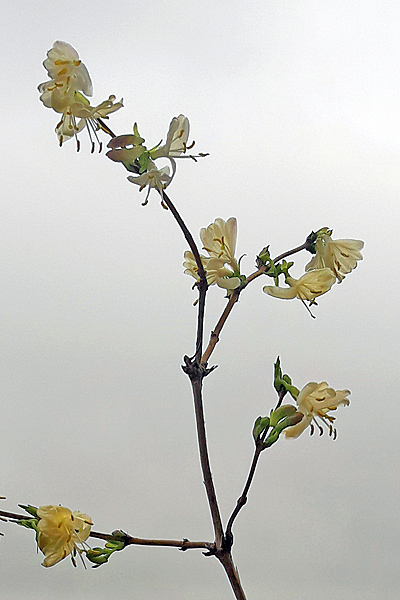 Sehr viel seltener wird die Wohlriechende Heckenkirsche (Lonicera fragrantissima) angepflanzt. Wie der Name schon verspricht, riechen die Blüten intensiv. In der Kombination mit der cremeweißen Blütenfarbe kann man vermuten, dass die Art in ihrer Heimat China von nachtaktiven Schmetterlingen bestäubt wird. Ich habe die Art im alten Botanischen Garten der RWTH Aachen kennengelernt, der leider ersatzlos aufgegeben wurde. Heute kenne ich sie nur noch vom Aachener Lousberg, wo ich sie vorige Woche blühend angetroffen habe. Das dürfte allerdings noch nicht allzu viel Leuten aufgefallen sein, weil die Pflanzen nicht an einem der unzähligen Promenadenwege wachsen sondern an der Fahrstraße zur Hochfläche.