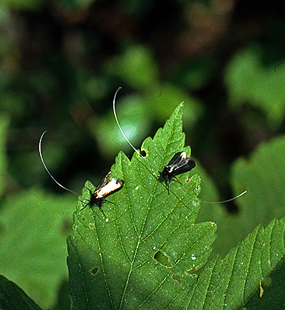 Es handelt sich um Männchen der Langhornmotte Adela reaumurella auf ihrem Balztanz. Der Körper ist vielleicht gerade mal 7mm lang, die Fühler sind aber um ein Vielfaches länger. Eigentlich ist das ganze Tier schwarz gefärbt. Besonders Fühler und Vorderflügel glänzen im Licht stark auf, so dass sie dann weiß bis bronzefarben aussehen.
