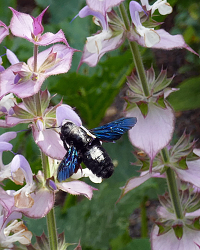 Ein dicker Brummer mit glitzernden Flügeln: Das ist eine Blauschwarze Holzbiene an der Blüte von Muskateller-Salbei.