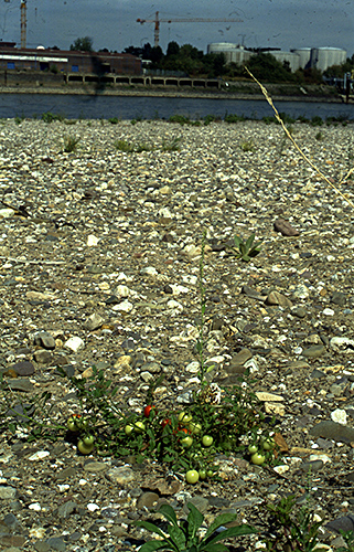 In Zeiten des Klimawandels sinkt der Rheinpegel immer häufiger und immer früher im Jahr. So findet man auf den trocken gefallenen Gleithängen zunehmend wärmeliebende Kulturpflanzen. Schon seit langem bekannt sind Vorkommen der Tomate (Solanum lycopersicum). Früher haben Botaniker das als unbeständige Verwilderungen angesehen, die vielleicht aus Gartenabfällen stammen. Heute ist die Tomate am ganzen Rhein verbreitet, und wie man am Foto sehen kann, kommt sie auch zur Fruchtreife. Man kann also davon ausgehen, dass die Tomate heute am Rhein fest eingebürgert ist.