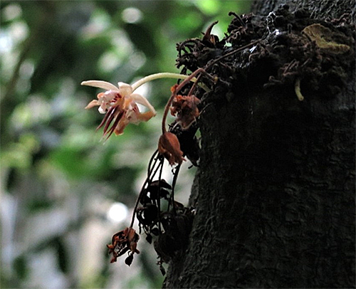 Der zur Familie der Malvengewächse gehörende Kakaobaum (Theobroma cacao) wächst als kleiner, bis etwa fünfzehn Meter hoher Baum im Unterholz der tropischen Regenwälder Mittel- und Südamerikas und kann das ganze Jahr über Blüten bilden. Wer schon einmal im Tropenhaus eines Botanischen Gartens einen Kakaobaum gesehen hat, dem ist vielleicht aufgefallen, dass die Blütenknospen direkt aus dem verholzten Stamm hervorbrechen. Diese botanische Besonderheit wird als Kauliflorie/Stammblütigkeit bezeichnet. Sie hat den Vorteil, dass die nach der Bestäubung entstehenden großen und schweren Früchte am Stamm besseren Halt finden als an dünnen Ästen.