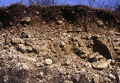 Bodenanriss bei Thuir im Dürener Muschelkalk. Unter der braunen Humusschicht liegt direkt das Grundgestein.