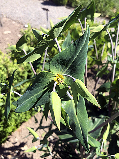 Euphorbia lathyris ist eine alte Kultur- und Heilpflanze, deren Heimat vermutlich im östlichen Mittelmeergebiet liegt. Die ein- oder zweijährig wachsende Kreuzblättrige Wolfsmilch liebt wintermilde und sommerwarme Standorte mit lockerem, nährstoffreichem Lehmboden und kann bis zu einem Meter hoch werden. Man findet sie oft auf Ruderalfluren und Weg- und Straßenrändern. Charakteristisch ist der kräftige, aufrechte Stängel mit den gekreuzt - gegenständig stehenden, lanzettlichen, dunkelgrünen Blättern, was sie zu einer attraktiven Gartenpflanze macht. Zur Blütezeit von Juni bis August erscheinen grüne Hochblätter mit einem Kleinstblütenstand, Cyathium genannt, mit einer zentralen weiblichen Blüte, die auf den dreinarbigen Fruchtknoten reduziert ist, und mehreren seitlich stehenden männlichen Blüten, die nur aus einem Staubblatt bestehen. Auffällig sind die gelben, zweihörnigen Honigdrüsen, die das Cyathium umgeben und Bienen, Wespen und Schwebfliegen zur Bestäubung anlocken. Sind die Samen reif, springt die Fruchtkapsel explosionsartig auf und schleudert die Samen weit heraus, was der Pflanze den Namen Springkraut eingebracht hat. Das dem Samen anhaftende ölhaltige Anhängsel (Elaiosom) verschleppen und fressen die Ameisen gerne und tragen damit zusätzlich zur Verbreitung der Samen bei. Wegen des hohes Gehalts an Öl in den Samen beschäftigen sich Forscher mit der möglichen Verwendung von Euphorbia lathyris zur Herstellung von Biodiesel.