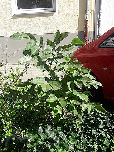 Spontaner Aufwuchs einer Walnuss an einem Aachener Parkplatz.