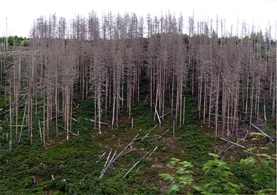 Abgestorbene Fichten am Brocken im HarzDie konventionelle Forstwirtschaft mit Kahlschlag und anschließender Wiederaufforstung ist kostenintensiv. Die ökologische Waldwirtschaft setzt auf natürliche Verjüngung. Der Wald ist ein komplexes Ökosystem und erhält sich selbst. Ohne Eingriffe würden weite Teile Deutschlands wieder zu Wald werden. Zu Zeiten der frühen Industrialisierung waren bei sehr hohem Holzbedarf viele Wälder übernutzt und zu Heide und mageren Triften degradiert. Heute liegt in Deutschland der Waldanteil flächenmäßig bei etwa einem Drittel.